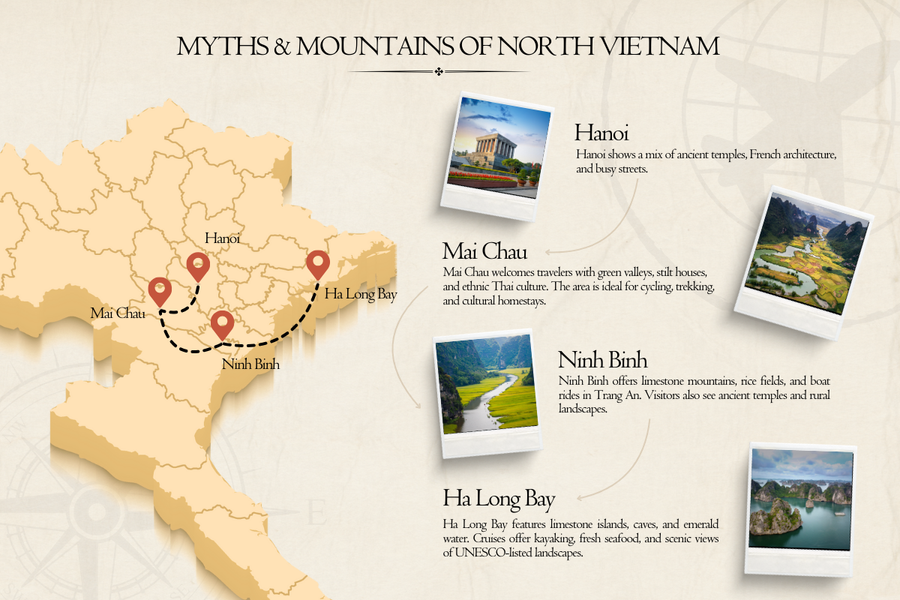 Over six days, guests can visit some of the best places in Northern Vietnam, combining cultural experiences with natural scenery. They will see the contrasts of Northern Vietnam, from the busy capital to rural valleys and tranquil rivers. Activities include cycling, trekking, cultural visits, and a scenic overnight cruise. The trip balances guided exploration and leisure time.
