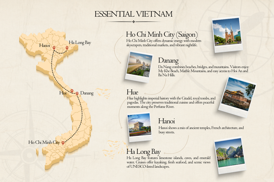 Key cities: Hanoi - Sapa - Halong Bay - Hue - Danang - Hoian - Saigon - Can Tho