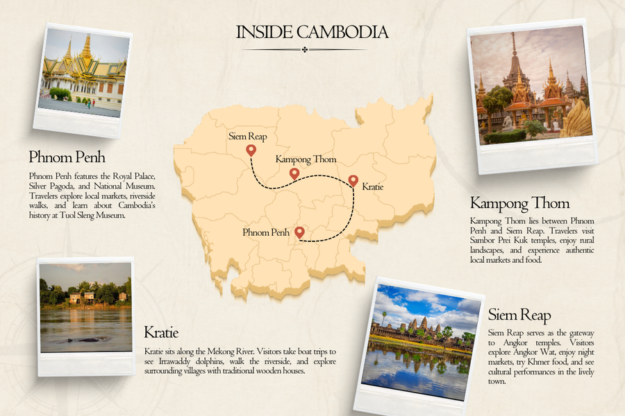 Key cities: Phnom Penh - Kampong Thom - Siem Reap - Battambang - Kep - Sihanouk Ville